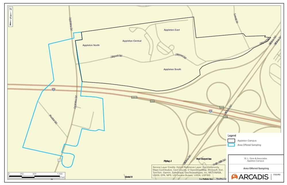 This aerial image shows the Appleton campus in Cecil County and highlights Gore’s environmental monitoring efforts — specifically tracking groundwater near the site: