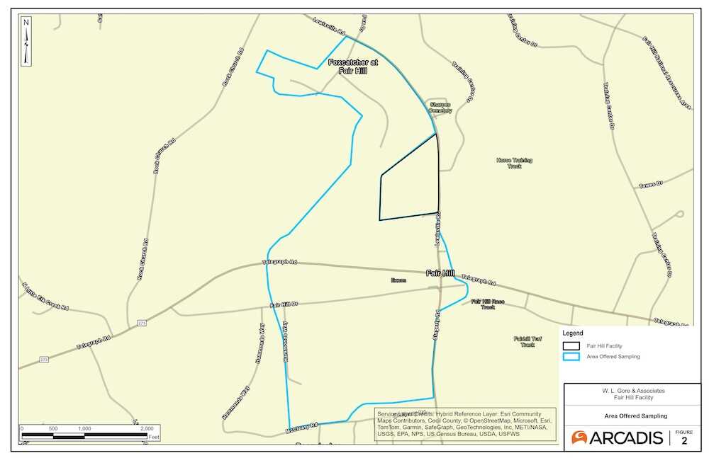 - Nearby residents are included in testing efforts. A designated sampling area surrounds the Fair Hill site, with Gore offering testing to private well owners in the community as a precautionary measure.
